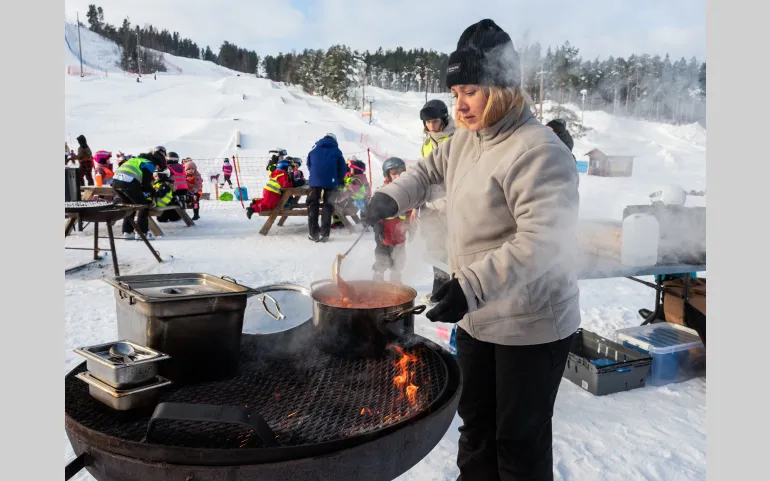 En bit upp i backen är utsikten slående, inte minst över sjön Runn med sina öar. Men i blickfånget finns också förskolan, mitt i ett ganska nybyggt bostadsområde. De båda avdelningarna har 29 barn var och i dag är ett tiotal frånvarande. Denna tisdag är alltså cirka femtio barn på plats i en skidbacke som visserligen är abonnerad, men inte inhägnad. Det kräver sin logistik och en del extrapersonal.