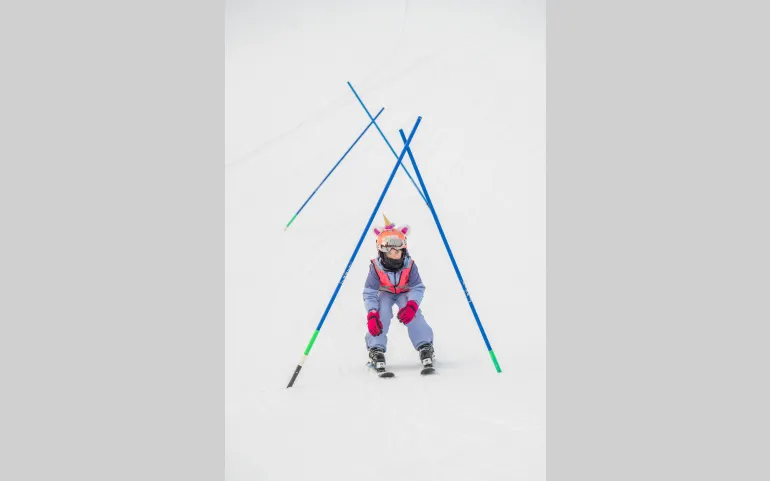 Men att ha skidåkning och snowboard på schemat kräver förstås mer än personal och logistik – det kräver också utrustning. Många av barnen har redan skidor, pjäxor och hjälm genom en skidintresserad familj. De som inte har det får låna. På förskolan har de snowboards som har skänkts av ett varumärke, som också fixat fram slalompinnarna till banorna. Inomhus kan de öva på balansbrädor.